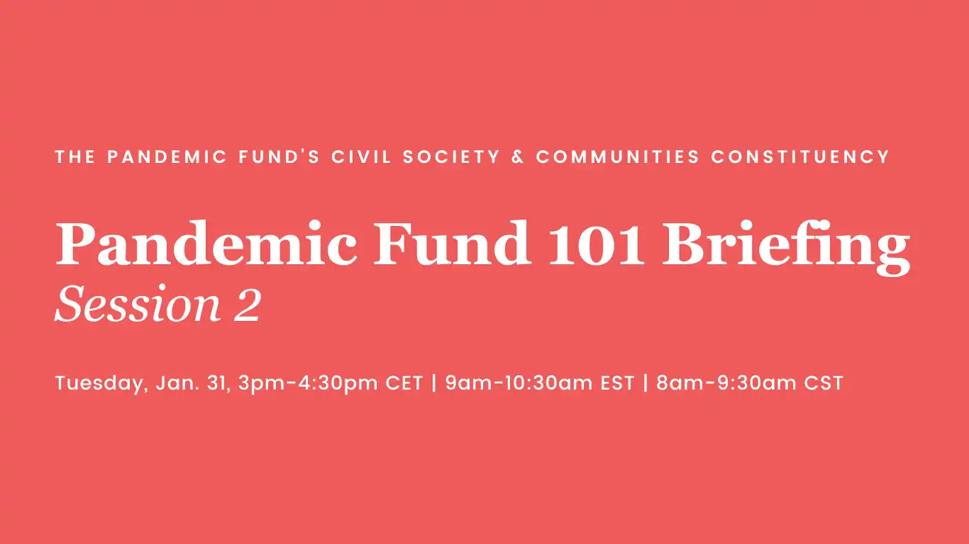 The second Pandemic Fund’s Civil Society & Communities Constituency Pandemic Fund 101 Briefing. Session hosts provide an overview of the Pandemic Fund’s history, role, and purpose. Recorded: Jan. 31, 2023.